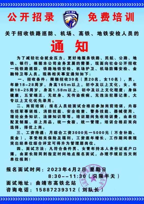 2023年曲靖市鐵路巡防、機場、高鐵、地鐵安檢人員招收通知
