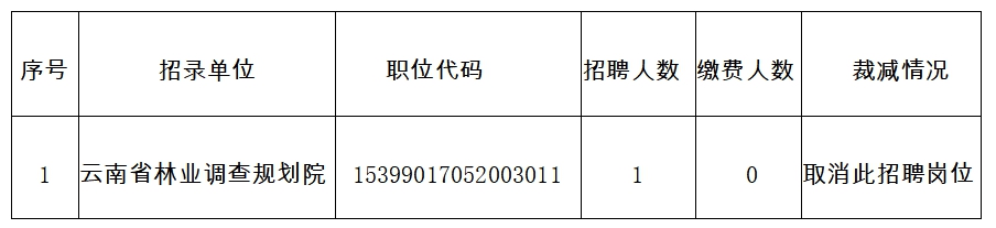 根據《2023年云南省林業(yè)和草原局事業(yè)單位公開招聘工作人員公告》,對實際繳費人數(shù)與計劃招聘人數(shù)比例未達到3:1的招聘崗位予以取消或相應遞減招聘人數(shù),截至2023年4月3日繳費結束,結合各崗位實際報名繳費情況,現(xiàn)將崗位裁減情況公告如下: