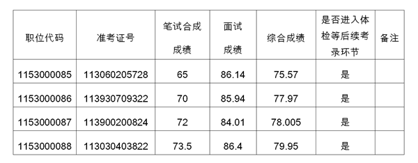 按照筆試合成成績(jī)、面試成績(jī)各占50%的比例合成,筆試合成成績(jī)、面試成績(jī)四舍五入后均保留至小數(shù)點(diǎn)后2位,綜合成績(jī)四舍五入后保留至小數(shù)點(diǎn)后3位。具體綜合成績(jī)?cè)斠?jiàn)附件。