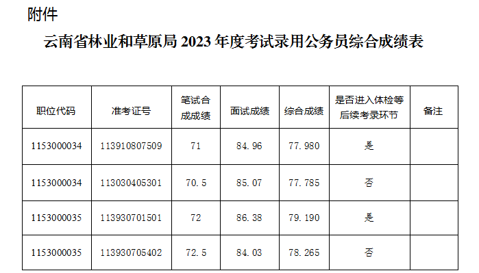 附件:云南省林業(yè)和草原局2023年度考試錄用公務(wù)員綜合成績表