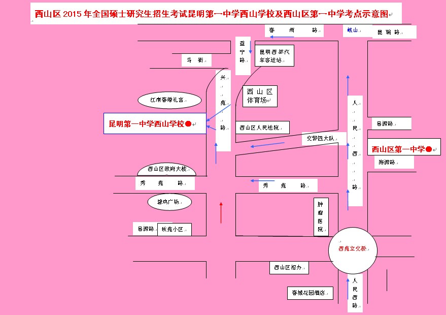 西山區(qū)2015年全國碩士研究生招生考試筆試?yán)ッ鞯谝恢袑W(xué)西山學(xué)校考點(diǎn)和西山區(qū)第一中學(xué)考點(diǎn)示意圖如下: