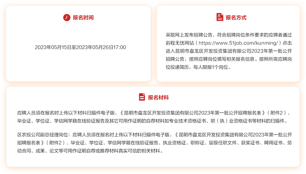 由昆明市盤龍區(qū)開發(fā)投資集團(tuán)有限公司委托第三方對應(yīng)聘者提交的報名信息及材料進(jìn)行資格初審。滿足本公告報名基本條件且同時滿足報考崗位資格條件的視為資格初審合格。凡本人填寫信息錯誤的自行負(fù)責(zé)。弄虛作假的,一經(jīng)查實將取消其應(yīng)聘資格和錄用資格。