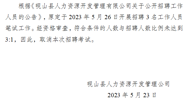 硯山縣人力資源開發(fā)管理有限公司關(guān)于取消招聘3名工作人員考試的公告