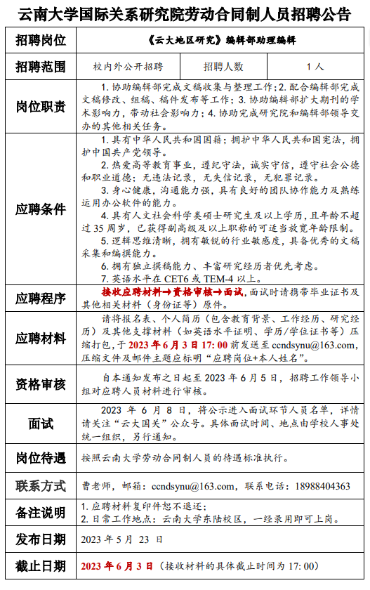 云南大學(xué)國際關(guān)系研究院勞動(dòng)合同制人員招聘公告