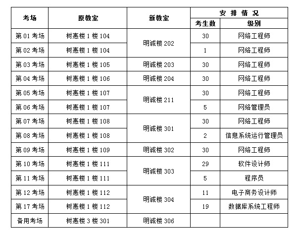 因2023年5月27日軟考筆試考場臨近同時開展大型校園招聘會的體育場,對考生答題造成較大干擾。經研究決定,將原本設于樹蕙樓的筆試考場調整至明誠樓,考生的考場號、座位號不變,僅教室發(fā)生改變。請廣大考生前往調整后的考場參加考試。