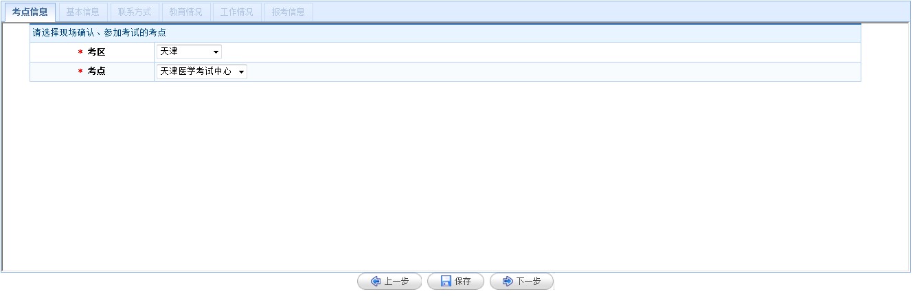 (1)第一項(xiàng),填寫“考點(diǎn)信息”,選擇報(bào)考的考區(qū)和考點(diǎn),點(diǎn)擊【下一步】進(jìn)入下一項(xiàng)填報(bào)項(xiàng)目。見下圖: