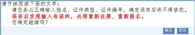 點(diǎn)擊“下一步”,提示個(gè)人信息是否填寫正確,點(diǎn)擊“確定”后如再發(fā)現(xiàn)基本信息有誤,無法在網(wǎng)報(bào)系統(tǒng)中進(jìn)行修改,考生須在登錄頁面重新注冊(cè)后重新報(bào)名。見下圖: