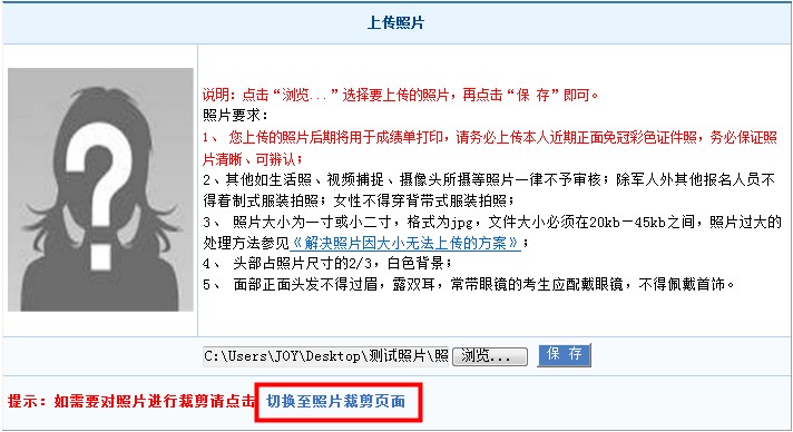在上傳照片界面,仔細(xì)閱讀紅色提示(注:照片的大小為一寸或兩寸,文件大小必須在20kb-45kb之間),點(diǎn)擊“瀏覽”,上傳照片并“保存”。見下圖: