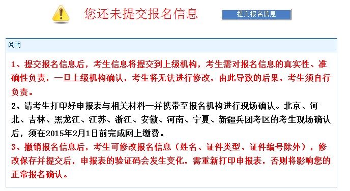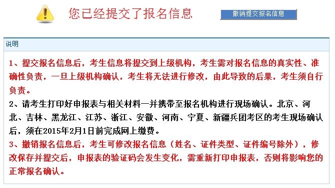 報(bào)名信息填寫完成,照片上傳成功后,考生應(yīng)仔細(xì)核對(duì)填寫信息是否準(zhǔn)確,核對(duì)確認(rèn)后須點(diǎn)擊“提交報(bào)名信息”進(jìn)行提交。報(bào)名信息提交后,考生不能在報(bào)名信息頁面進(jìn)行修改,如需修改信息,考生須點(diǎn)擊“撤銷提交報(bào)名信息”撤銷已提交的信息后再進(jìn)行修改信息的操作。