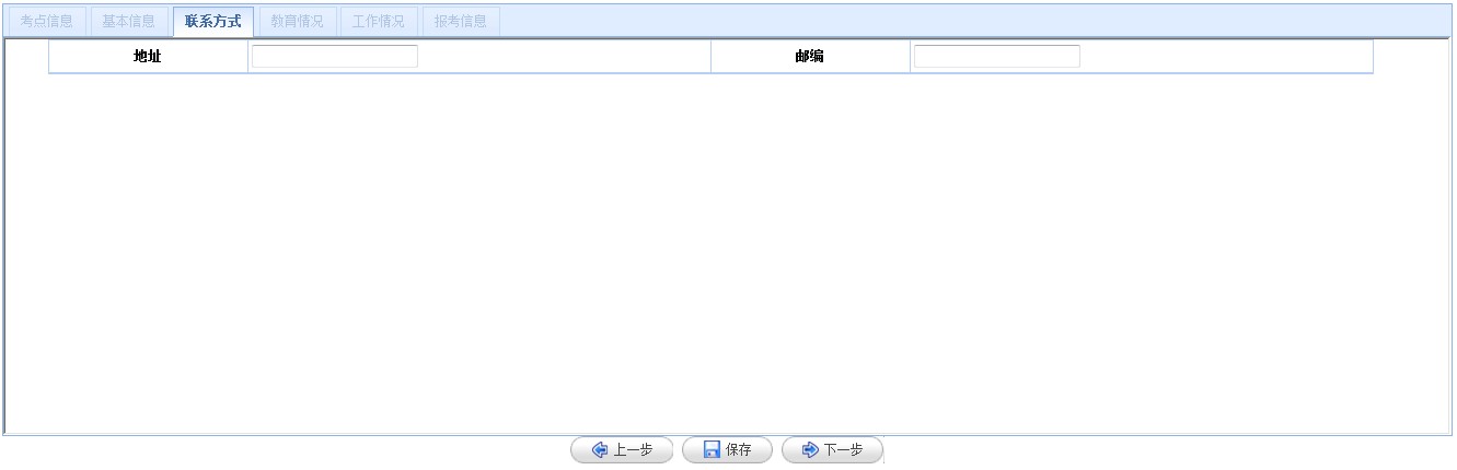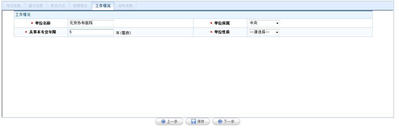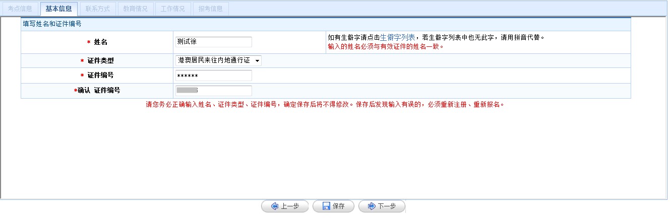 【填寫/修改報(bào)名信息】需要考生依次填寫“考點(diǎn)信息”、“基本信息”、“聯(lián)系方式”、“教育情況”、“工作情況”、“報(bào)考信息”六項(xiàng)內(nèi)容。
