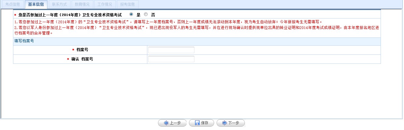 如果輸入信息正確無誤,點(diǎn)擊“確定”后系統(tǒng)會(huì)提示考生選擇是否參加過上一年度(2014年度)衛(wèi)生專業(yè)技術(shù)資格考試。首次參加考試的考生選擇“否”,歷史考生請(qǐng)選擇“是”,同時(shí)需輸入上一年度檔案號(hào),點(diǎn)擊“下一步”后系統(tǒng)將自動(dòng)調(diào)出該考生上一年度的報(bào)名信息,除姓名、證件類型、證件編號(hào)信息之外,考生可以對(duì)有變更的報(bào)名信息進(jìn)行修改。(注:考生如需修改姓名、證件類型、證件編號(hào)信息,請(qǐng)準(zhǔn)備相應(yīng)的證明材料,在規(guī)定的現(xiàn)場(chǎng)確認(rèn)時(shí)間內(nèi)到指定地點(diǎn)進(jìn)行修改。)