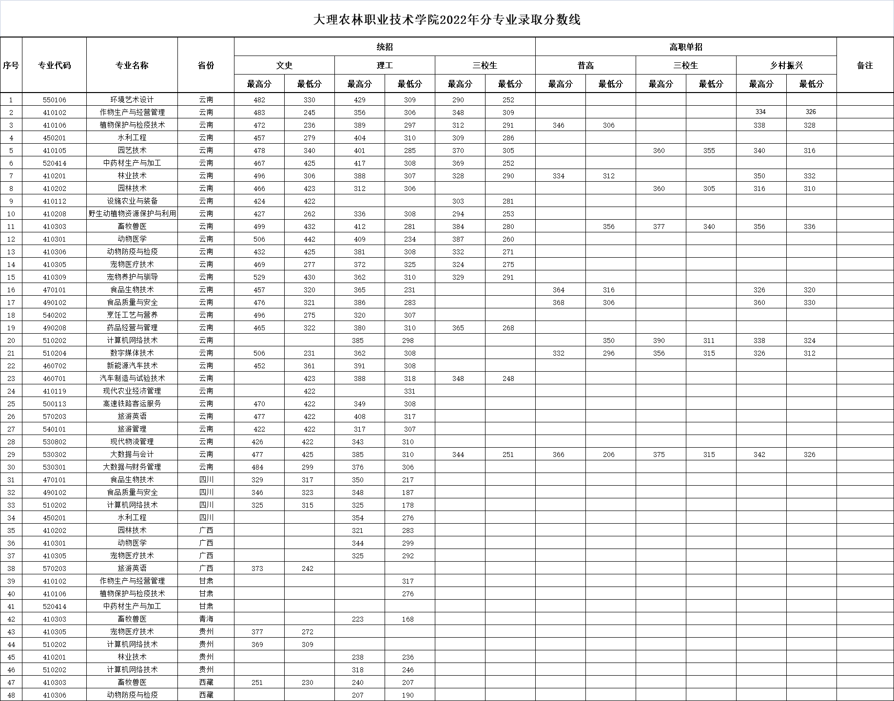 大理農(nóng)林職業(yè)技術(shù)學(xué)院2022年各專業(yè)錄取分?jǐn)?shù)線