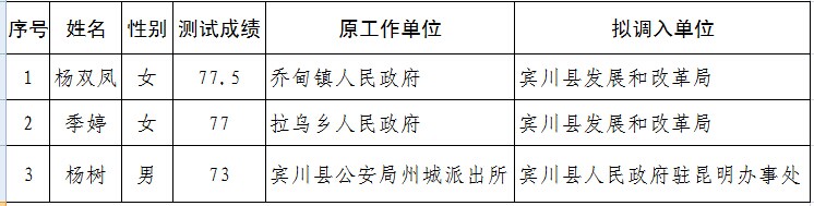 根據(jù)《賓川縣縣直機(jī)關(guān)公開(kāi)選調(diào)公務(wù)員暫行辦法》和《關(guān)于認(rèn)真做好2014—2015年縣直機(jī)關(guān)公開(kāi)選調(diào)公務(wù)員的通知》規(guī)定,經(jīng)基礎(chǔ)知識(shí)測(cè)試、用人單位考察和縣政府審批,現(xiàn)將第二批擬調(diào)動(dòng)人員情況公示如下: