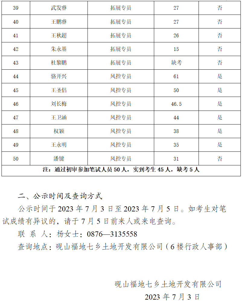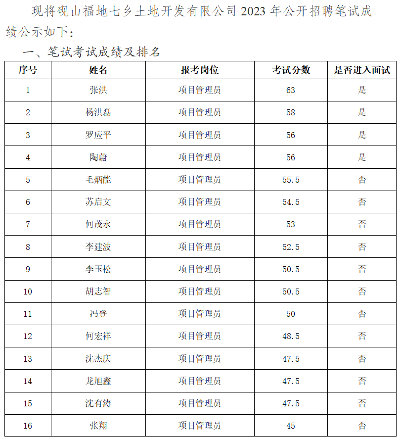 硯山福地七鄉(xiāng)土地開發(fā)有限公司 2023年公開招聘筆試成績公示