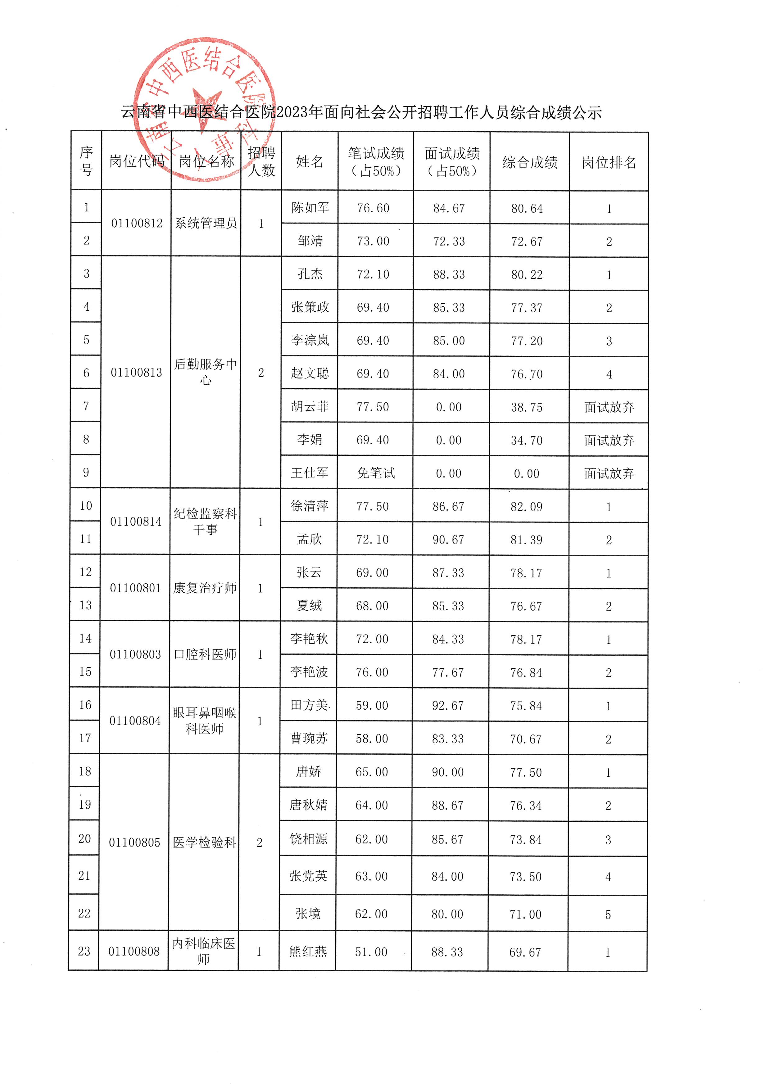 云南省中西醫(yī)結(jié)合醫(yī)院2023年面向社會 公開招聘工作人員綜合成績公示 根據(jù)《云南省衛(wèi)生健康委所屬和聯(lián)系單位2023年面向社會公開招聘工作人員的公告》的要求,現(xiàn)將2023年面向社會公開招聘工作人員綜合成績進(jìn)行公示,公示時間:2023年7月8日至7月14日。
