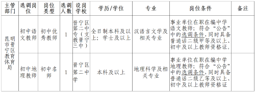 為進一步加強教師隊伍建設(shè),云南省昆明市晉寧區(qū)教育體育局決定公開選調(diào)初中教師2名?,F(xiàn)將有關(guān)事項公告如下:
