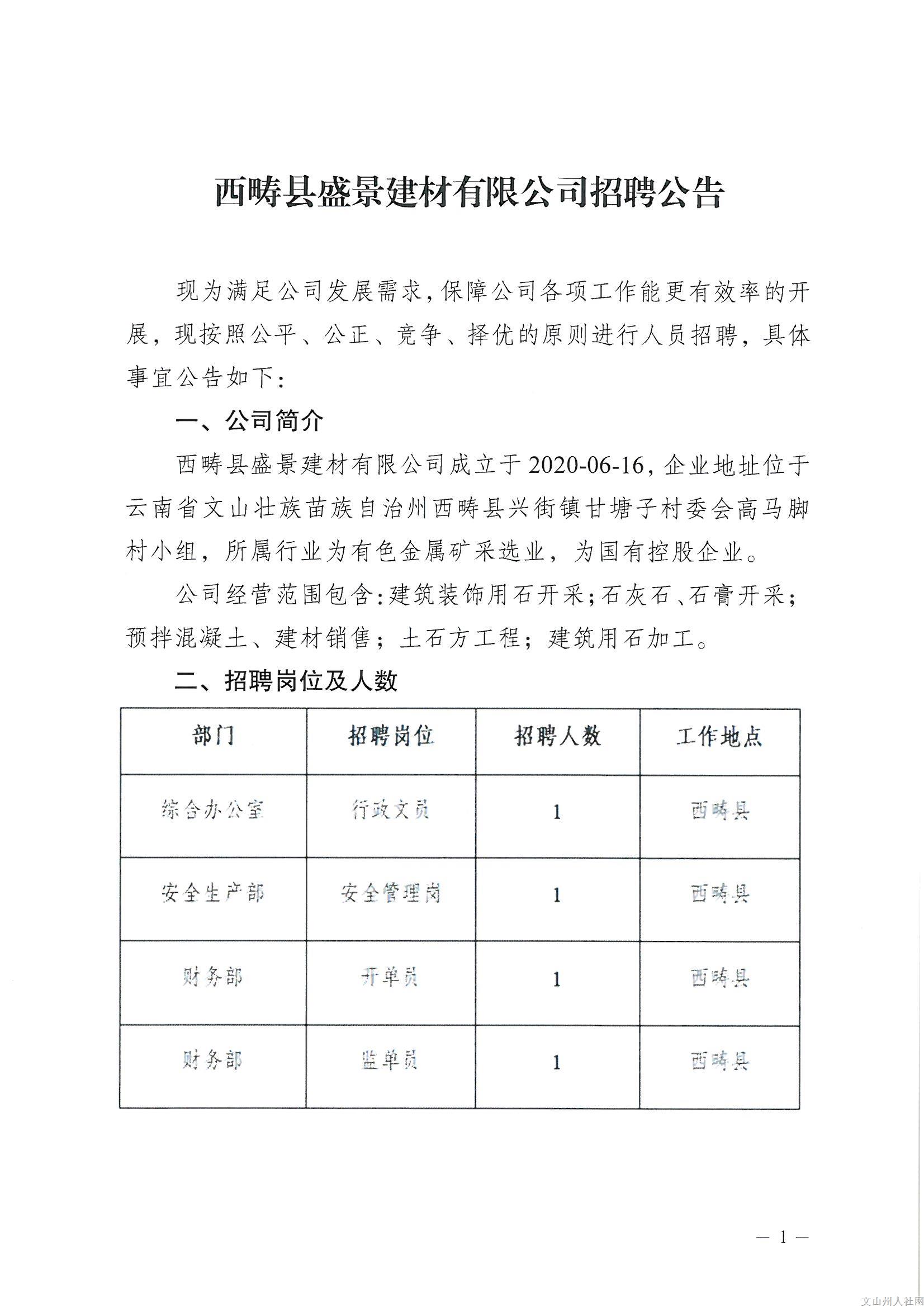 西疇縣盛景建材有限公司招聘公告