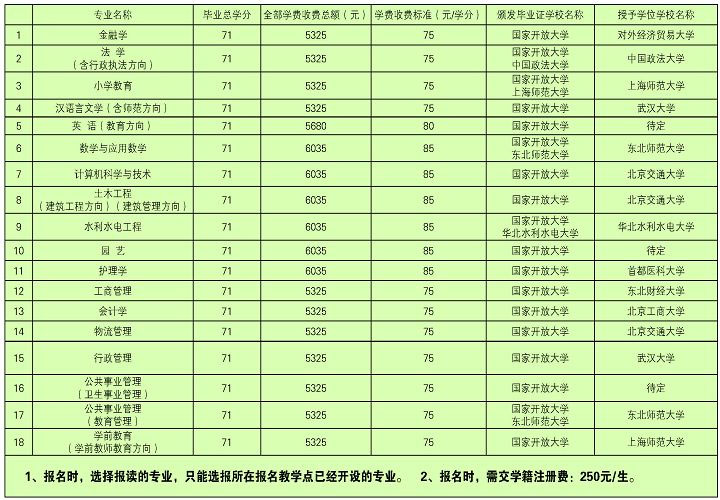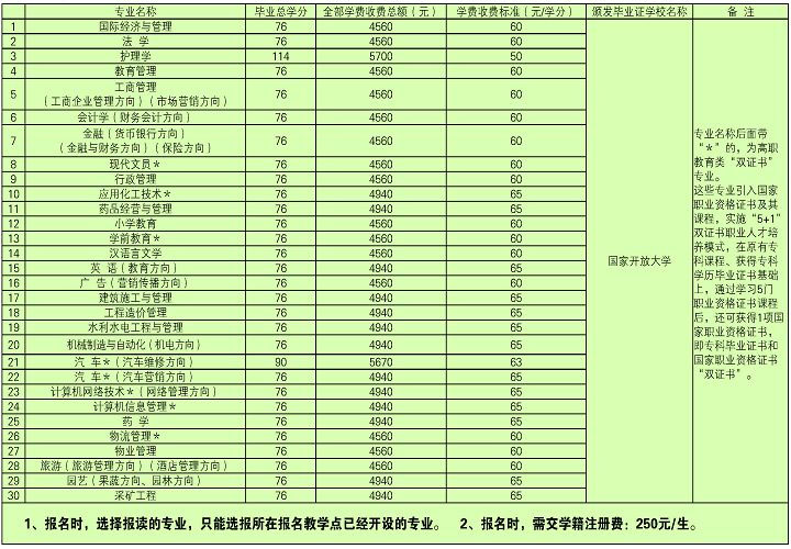 報(bào)名手續(xù):1、報(bào)名時(shí),須交驗(yàn)有效畢業(yè)證書(shū)原件;提交身份證和畢業(yè)證書(shū)復(fù)印件各1份,免冠數(shù)碼電子照片1份,電子照片要求為彩色圖像、背景為藍(lán)色、被拍攝人著白色或淺色系衣服、150(寬)×210(高)像素、文件大小不能超過(guò)40K,并按照1人1個(gè)圖像文件的方式存儲(chǔ),圖像文件格式為“jpg”;2、填寫(xiě)《國(guó)家開(kāi)放大學(xué)(中央廣播電視大學(xué))“開(kāi)放教育”學(xué)生報(bào)名登記表》和《入學(xué)資格承諾書(shū)》;3、交納學(xué)籍注冊(cè)建檔費(fèi)250元。其中:
