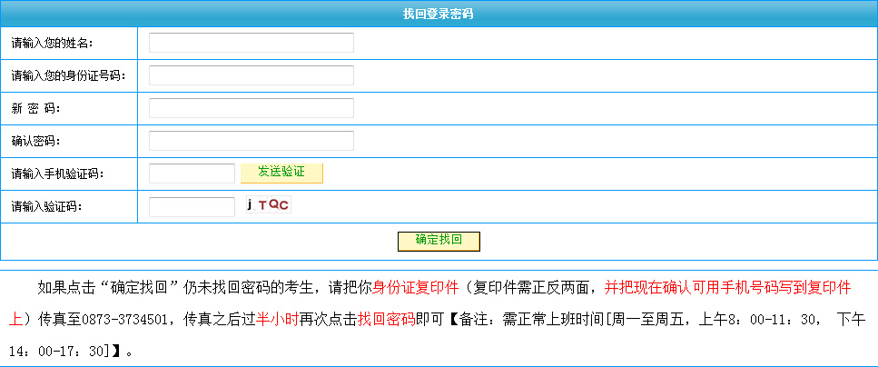 點(diǎn)擊登錄界面上的“找回密碼”進(jìn)入密碼找回頁面,然后按要求填寫相關(guān)信息,請(qǐng)務(wù)必正確填寫姓名和身份證號(hào),填寫完姓名和身份證號(hào)及新密碼以后,點(diǎn)擊“發(fā)送驗(yàn)證”按鈕,手機(jī)將收到一條驗(yàn)證碼,把手機(jī)驗(yàn)證碼輸入對(duì)應(yīng)文本框中,并輸入圖片驗(yàn)證碼后點(diǎn)擊“確定找回”,系統(tǒng)將會(huì)提示修改成功。