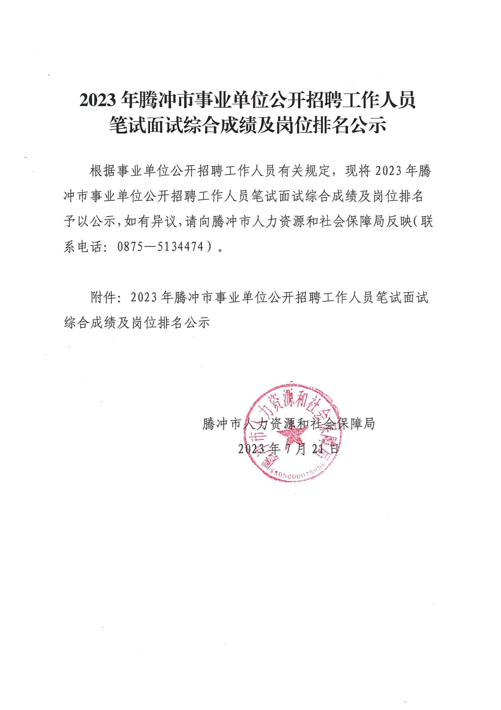 2023年騰沖市事業(yè)單位公開招聘工作人員筆試面試綜合成績(jī)及崗位排名公示
