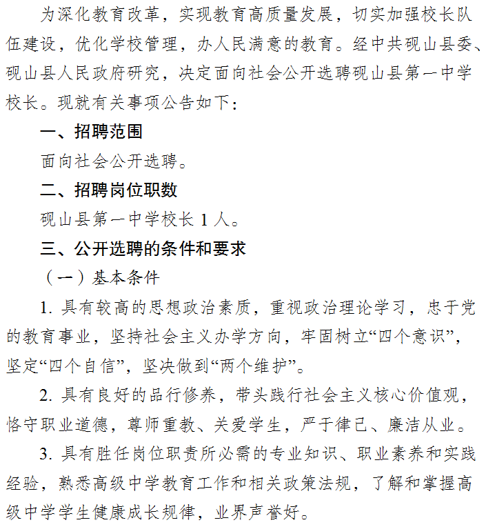 硯山縣面向社會(huì)公開(kāi)選聘硯山縣第一中學(xué)校長(zhǎng)公告