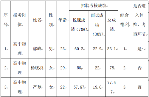 根據(jù)《昆明市晉寧區(qū)第二中學(xué)2023年公開招聘臨聘教師招聘簡章》,學(xué)校于2023年7月27日對報考我校高中物理教學(xué)崗位資格復(fù)審?fù)ㄟ^的3位教師進(jìn)行說課、面試考核,郭峰以總成績83.1分,綜合排名第一,將進(jìn)入體檢、考察環(huán)節(jié);具體情況公示如下: