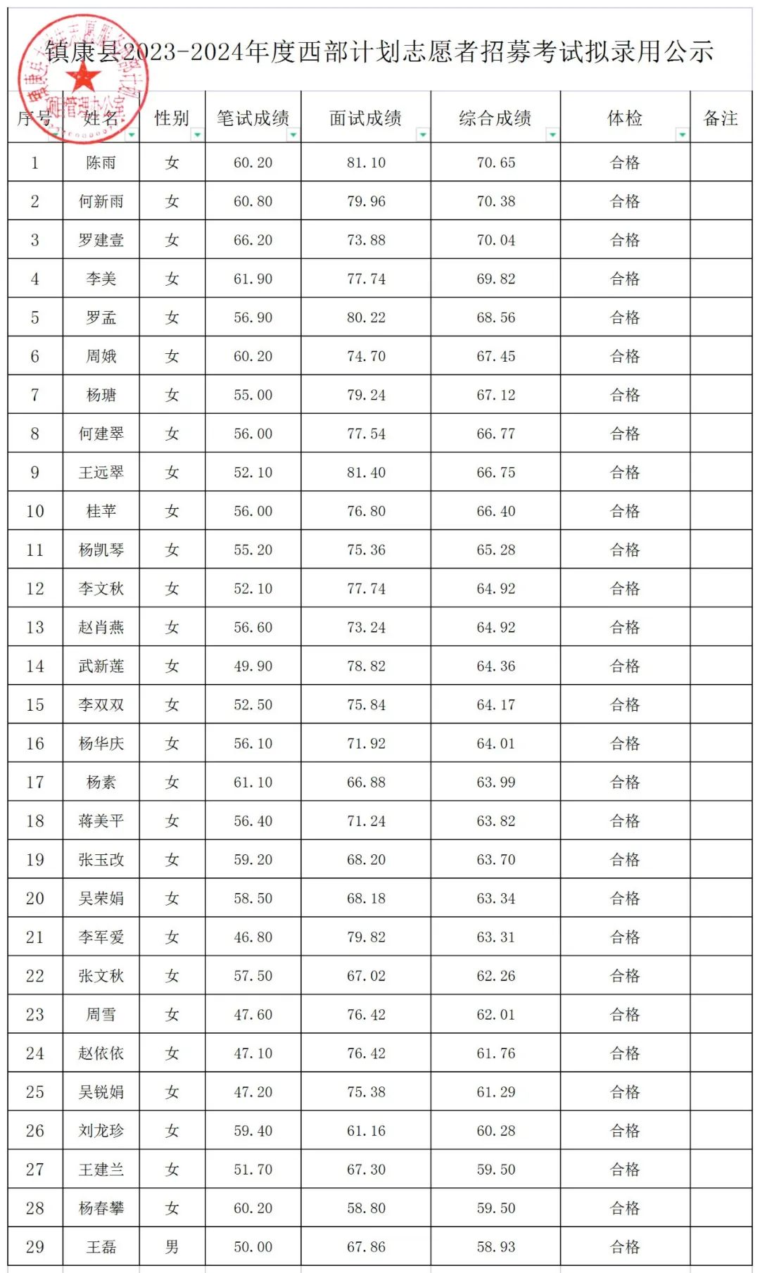 根據(jù)臨滄市項目辦《關(guān)于做好2023-2024年度云南省大學生志愿服務西部計劃省級地方項目招錄考試工作的通知》要求,經(jīng)過筆試、面試、體檢等程序,招錄人數(shù)根據(jù)最新在崗志愿者離崗情況調(diào)整,擬錄用陳雨等29名應屆畢業(yè)生為鎮(zhèn)康縣大學生志愿服務西部計劃云南省地方項目志愿者,現(xiàn)予以公示:
