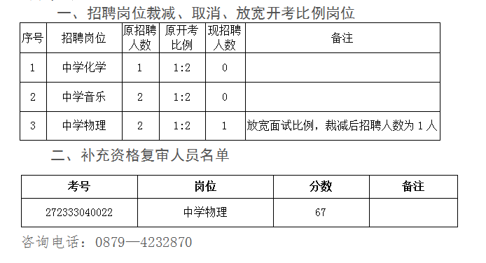 根據(jù)《云南省教育廳關(guān)于2023 年中央特崗教師招聘考試的公告》《普洱市 2023 年中央特崗教師招聘考試的公告》和《墨江哈尼族自治縣2023 年中央特崗計(jì)劃教師公開招聘考試公告》等相關(guān)精神,現(xiàn)將2023年墨江哈尼族自治縣特崗教師招聘崗位裁減、取消、放寬開考比例崗位及補(bǔ)充資格復(fù)審人員等相關(guān)情況公告如下: