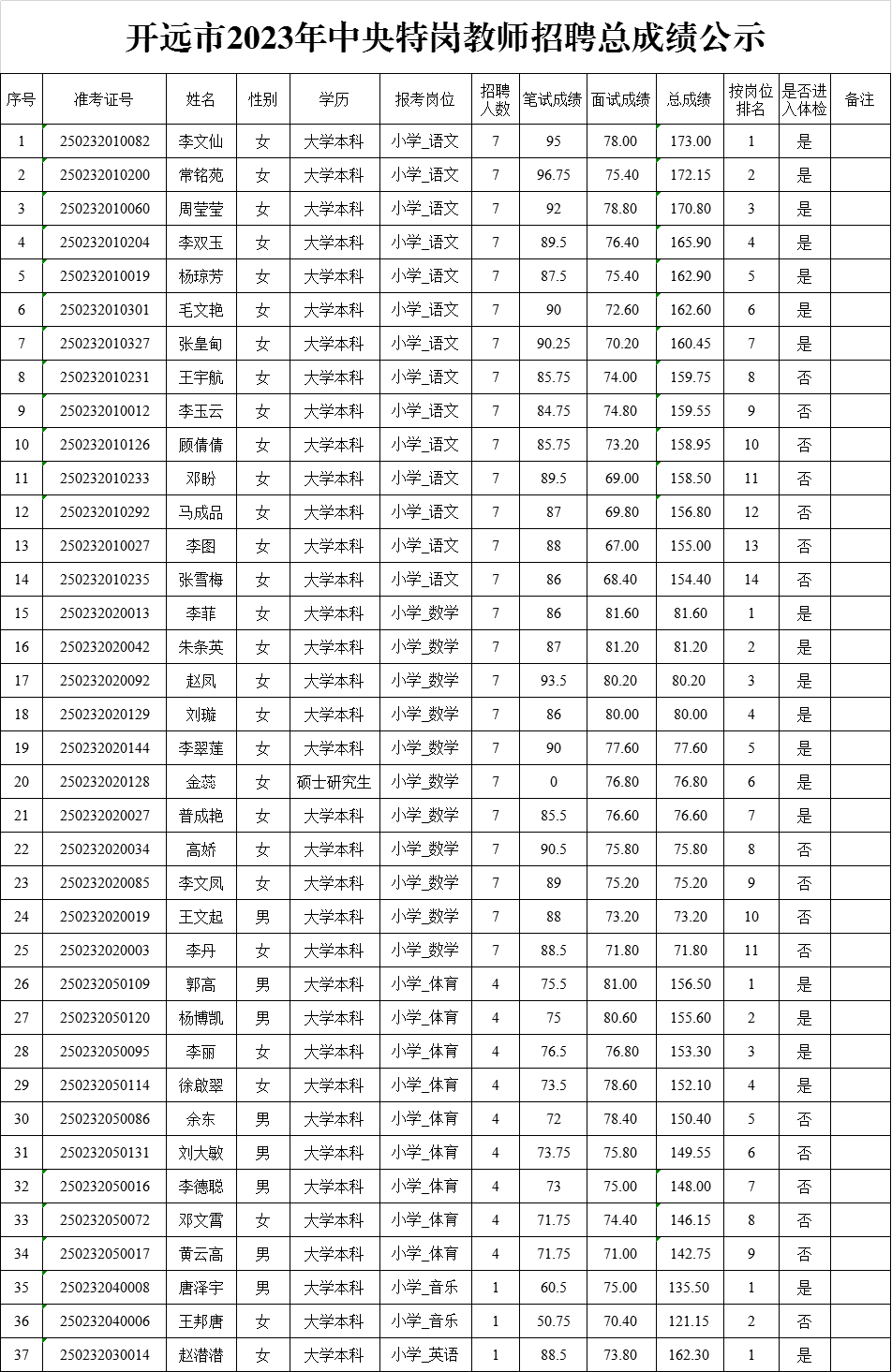 開遠(yuǎn)市2023年中央特崗教師招聘總成績公示