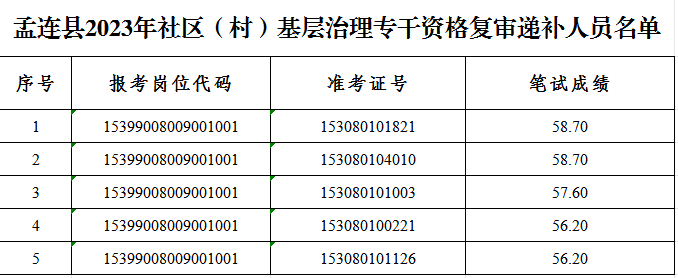 報考孟連縣2023年社區(qū)(村)基層治理專干、符合《云南省2023年社區(qū)(村)基層治理專干招聘公告》規(guī)定的進(jìn)入資格復(fù)審第一批次遞補(bǔ)的人員。