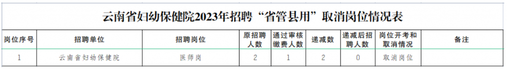 按照云南省事業(yè)單位招聘工作人員相關(guān)政策規(guī)定和《云南省衛(wèi)生健康委所屬和聯(lián)系單位2023年面向“省管縣用”醫(yī)務(wù)人員公開招聘的公告》,現(xiàn)將報(bào)名及資格審核后因未達(dá)到開考比例,相應(yīng)取消招聘崗位情況進(jìn)行公告。
