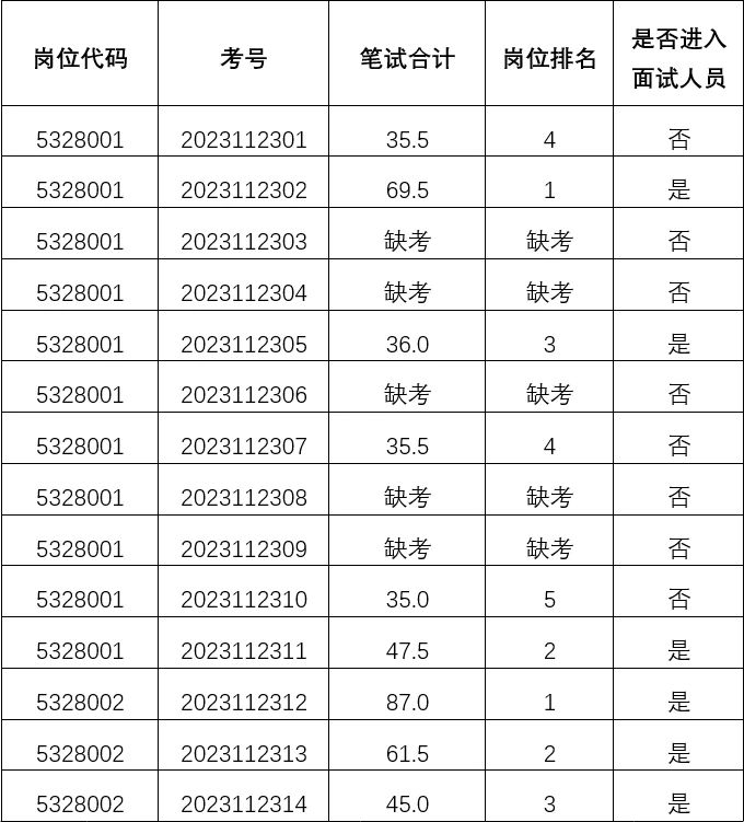 根據(jù)筆試成績從高到低的順序,按崗位招聘人數(shù)與進(jìn)入面試人數(shù)1:3的比例確定進(jìn)入面試人員,若筆試成績出現(xiàn)并列的,則并列進(jìn)入面試。應(yīng)聘人員自愿放棄面試資格的,按筆試成績從高到低依次遞補(bǔ)進(jìn)入面試。
