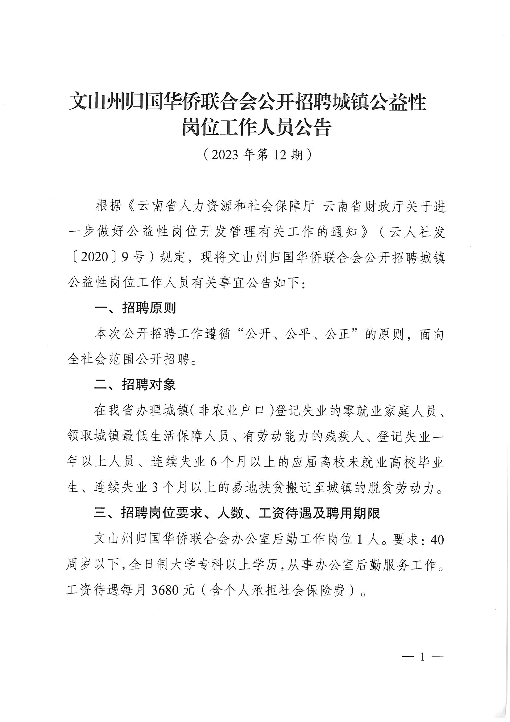2023年文山州歸國華僑聯(lián)合會招聘城鎮(zhèn)公益性崗位工作人員公告