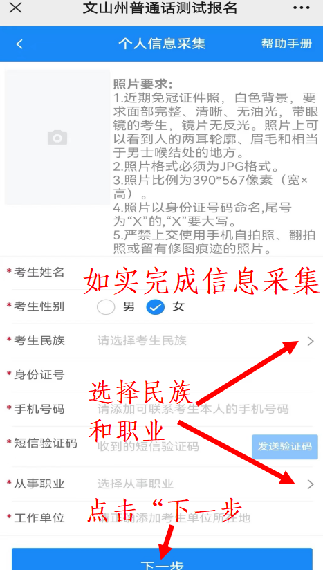 4.按要求如實(shí)完成個(gè)人信息采集之后進(jìn)行下一步。其中,“工作單位”需填寫到具體信息(如XX市XX縣XX鎮(zhèn)XX單位),如無單位請(qǐng)?zhí)顚懢唧w身份證地址,字?jǐn)?shù)不能超過30個(gè)字。