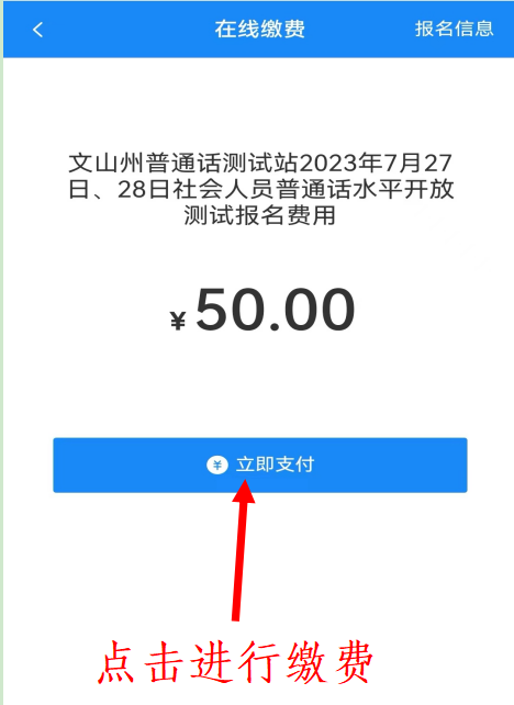 5.確認(rèn)個(gè)人信息無誤后,進(jìn)入繳費(fèi)頁面。根據(jù)《國家普通話水平測試規(guī)程》,信息錯(cuò)誤(準(zhǔn)考證上個(gè)人信息與本人身份證信息不相符)的應(yīng)試人一律不得參加測試,請(qǐng)考生報(bào)名時(shí)反復(fù)確認(rèn)個(gè)人信息。