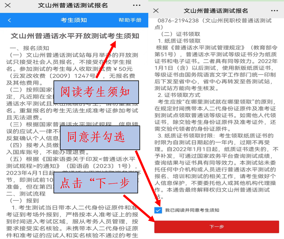 3.閱讀《文山州普通話水平開放測試考生須知》,同意并接受之后進(jìn)行下一步。