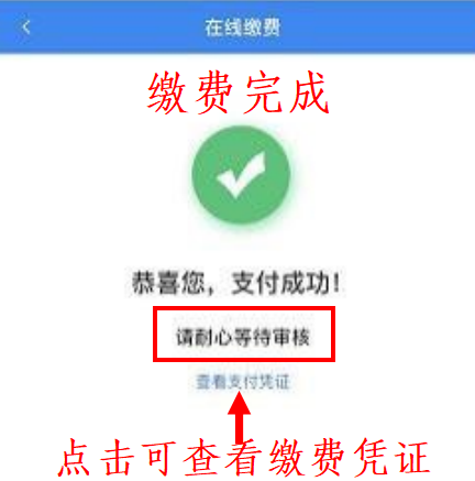 6.點(diǎn)擊“立即支付”進(jìn)行繳費(fèi),繳費(fèi)完成后可查看支付憑證并等待審核。支付之前頁面不能中斷(例如:退出平臺(tái)、接電話、斷網(wǎng)、切換頁面等),支付成功后無法退費(fèi)。