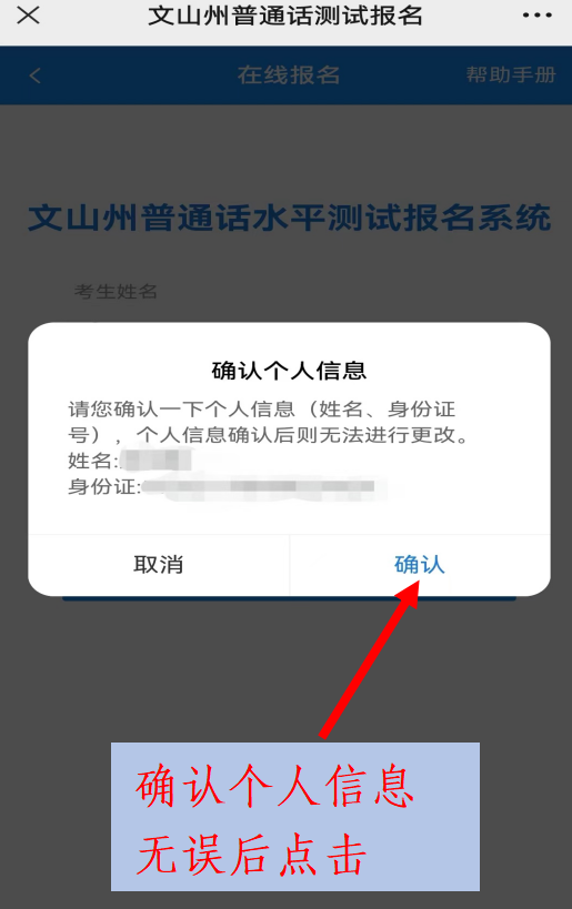 2.閱讀并確認(rèn)測試通告完整信息,點(diǎn)擊“在線報(bào)名”之后,按要求如實(shí)填寫考生姓名、身份證號(hào)碼,并確認(rèn)個(gè)人信息無誤。