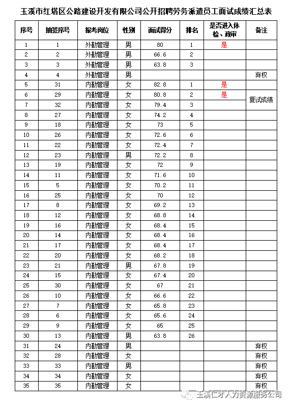 根據(jù)《玉溪市紅塔區(qū)公路建設(shè)開發(fā)有限公司公開招聘勞務(wù)派遣員工公告》,通過資格初審,報名人數(shù)共35名(項目現(xiàn)場管理4名,項目內(nèi)勤管理31名)。2023年12月18日上午9:00進行面試,實際參加面試人數(shù)29名(項目現(xiàn)場管理棄權(quán)1名,項目內(nèi)勤管理棄權(quán)5名)。經(jīng)過面試,成績經(jīng)全程監(jiān)督、現(xiàn)場打分確定,現(xiàn)將面試成績予以公示。并根據(jù)《玉溪市紅塔區(qū)公路建設(shè)開發(fā)有限公司公開招聘勞務(wù)派遣員工公告》,將進入下一環(huán)節(jié)--體檢政審人員名單進行公示,公示期共3天,自2023年12月20日至12月22日。公示期間如有問題、意見、建議,請在上述規(guī)定時間內(nèi)(上午8:30-11:30,下午14:30-17:30)致電:19987714651(尹老師)。