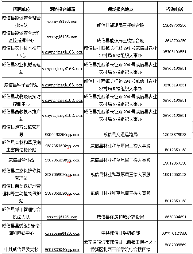 | 16 | 威信縣能源安全監(jiān)管執(zhí)法隊(duì) | 威信縣 | 財(cái)政全額撥款 | 能源安全監(jiān)管執(zhí)法 | 專業(yè)技術(shù)崗位 | 從事能源安全監(jiān)管執(zhí)法及能源安全檢查等相關(guān)工作 | 1 | 本科及以上 | 普通招生計(jì)劃 | 學(xué)士及以上 | 面試 | 不限 | 不限 | 18至35周歲 | 不限 | 本科專業(yè):采礦工程、地質(zhì)工程、智能采礦工程、研究生專業(yè):礦業(yè)工程。 | 該崗位主要從事能源安全監(jiān)管,須下井開展檢查工作,限男性;2024年畢業(yè)的“雙一流”建設(shè)高校(2017年9月20日國(guó)家公布的世界一流大學(xué)建設(shè)高校、一流學(xué)科建設(shè)高校相對(duì)應(yīng)的一流建設(shè)學(xué)科;2017年9月20日國(guó)家正式發(fā)布”雙一流“高校名單以前的原985、211工程院校)普通招生計(jì)劃本科學(xué)歷,并取得學(xué)士學(xué)位畢業(yè)生(以高考錄取時(shí)為準(zhǔn));2020年至2024年畢業(yè)的普通招生計(jì)劃碩士研究生及以上學(xué)歷畢業(yè)生,專業(yè)可放寬到相近專業(yè);服務(wù)期內(nèi)的定向研究生不得報(bào)考。 |