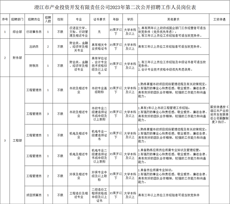 按照《澄江市人力資源和社會保障局 澄江市人民政府國有資產(chǎn)監(jiān)督管理委員會關(guān)于印發(fā)〈澄江市市屬國有企業(yè)公開招聘工作人員辦法(試行)〉的通知》(澄人社發(fā)〔2021〕17號)文件精神,結(jié)合澄江市產(chǎn)業(yè)投資開發(fā)有限責(zé)任公司(簡稱:產(chǎn)投公司)組織架構(gòu)和業(yè)務(wù)發(fā)展需要,現(xiàn)將產(chǎn)投公司2023年公開招聘工作人員有關(guān)事項公告如下: