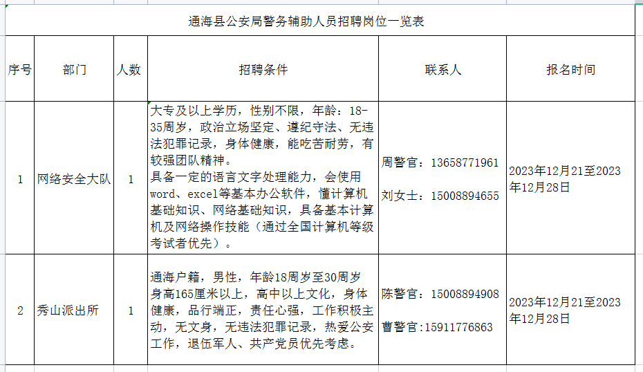 根據(jù)工作需要,通??h公安局面向社會公開招聘警務(wù)輔助人員2名,現(xiàn)將有關(guān)事項(xiàng)公告如下: