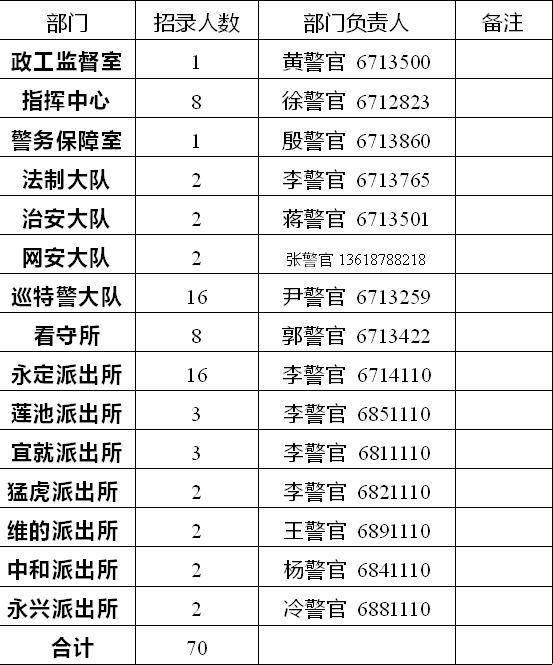 永仁縣公安局為規(guī)范警務輔助人員管理,重新組建局機關和各派出所成員,現面向社會公開招聘70名輔警。
