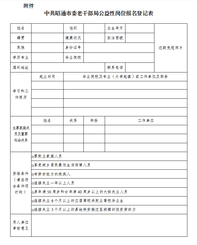 附件:中共昭通市委老干部局公益性崗位報名登記表