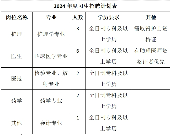 為促進青年就業(yè)見習,按照有關(guān)規(guī)定要求,結(jié)合我院發(fā)展規(guī)劃、科室設(shè)置及科室人員需求,現(xiàn)擬面向社會公開招聘仁德街道辦事處中心衛(wèi)生院2024年就業(yè)見習人員。