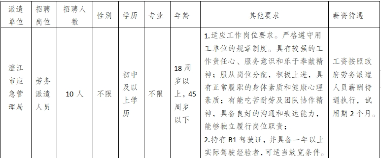 澄江市應(yīng)急管理局因工作需要,委托澄江市啟澄人力資源有限責(zé)任公司面向社會(huì)公開(kāi)招聘政府專職消防員10名,招聘相關(guān)事項(xiàng)如下: