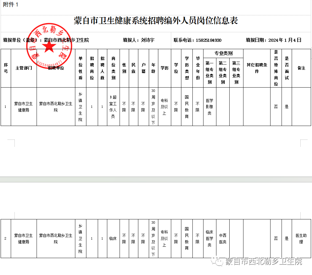 附件1:蒙自市西北勒鄉(xiāng)衛(wèi)生院招聘編外人員崗位信息表