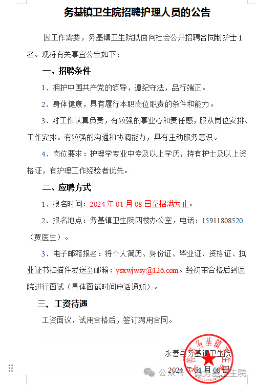 務(wù)基鎮(zhèn)衛(wèi)生院招聘護(hù)理人員的公告