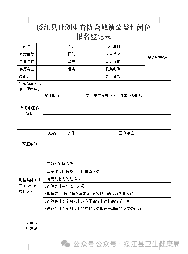附件:綏江縣計(jì)劃生育協(xié)會(huì)城鎮(zhèn)公益性崗位報(bào)名登記表
