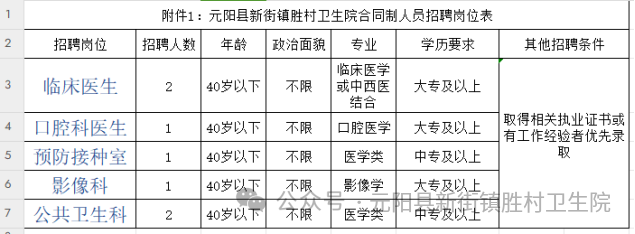 附件1:元陽縣新街鎮(zhèn)勝村衛(wèi)生院合同制人員招聘崗位表